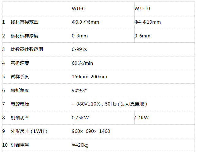 如您有需求或任何想要咨詢的內容,歡迎您隨時致電我司,我們將有專業(yè)的技術客服人員為您竭誠服務。垂詢熱線:0531-85991949。以下是WJJ系列電動反復彎曲試驗機的詳細內容 產品規(guī)格: WJJ-6 WJJ-10電動反復彎曲試驗機重要功能: WJJ系列電動反復彎曲試驗機對金屬線材、板材進行反復彎曲試驗及測試,以檢驗金屬制品連續(xù)彎曲的適應能力。 立式整體結構。 WJJ系列電動反復彎曲試驗機主要由機座、電控部分、傳動、夾持、顯示、夾具、手輪等部件組成。 蝸桿、蝸輪傳動。微動開關采集試樣折斷信號。 偏心輪30r/min,扇形齒輪左右轉動30°,彎曲臂實現(xiàn)左右擺動90°,60次/min。 試樣折斷后,電磁離合器脫開。 漲緊機構,對小試樣施加漲緊力。 手輪夾緊、松開試樣,方便、快速。 重要參數(shù):